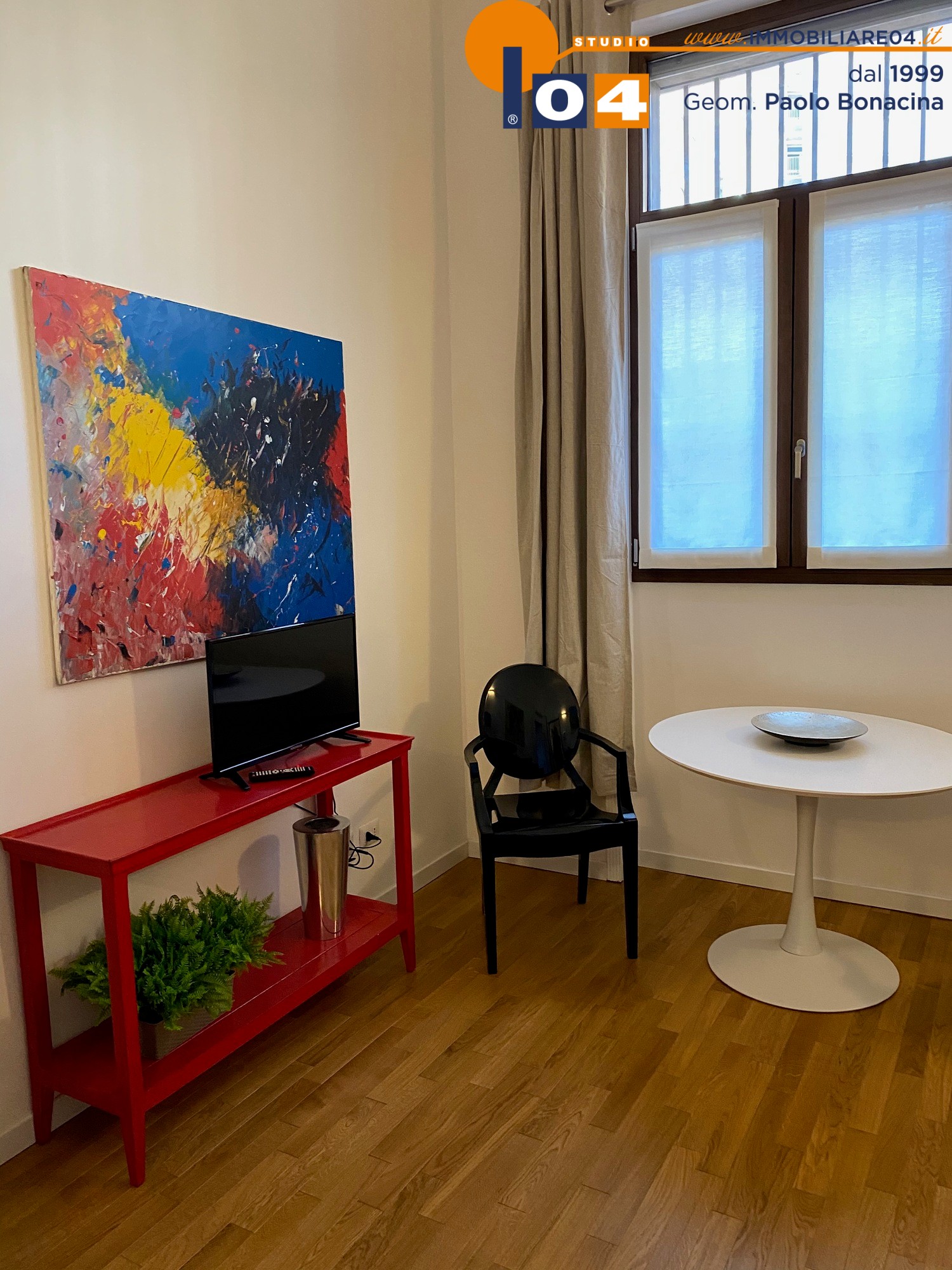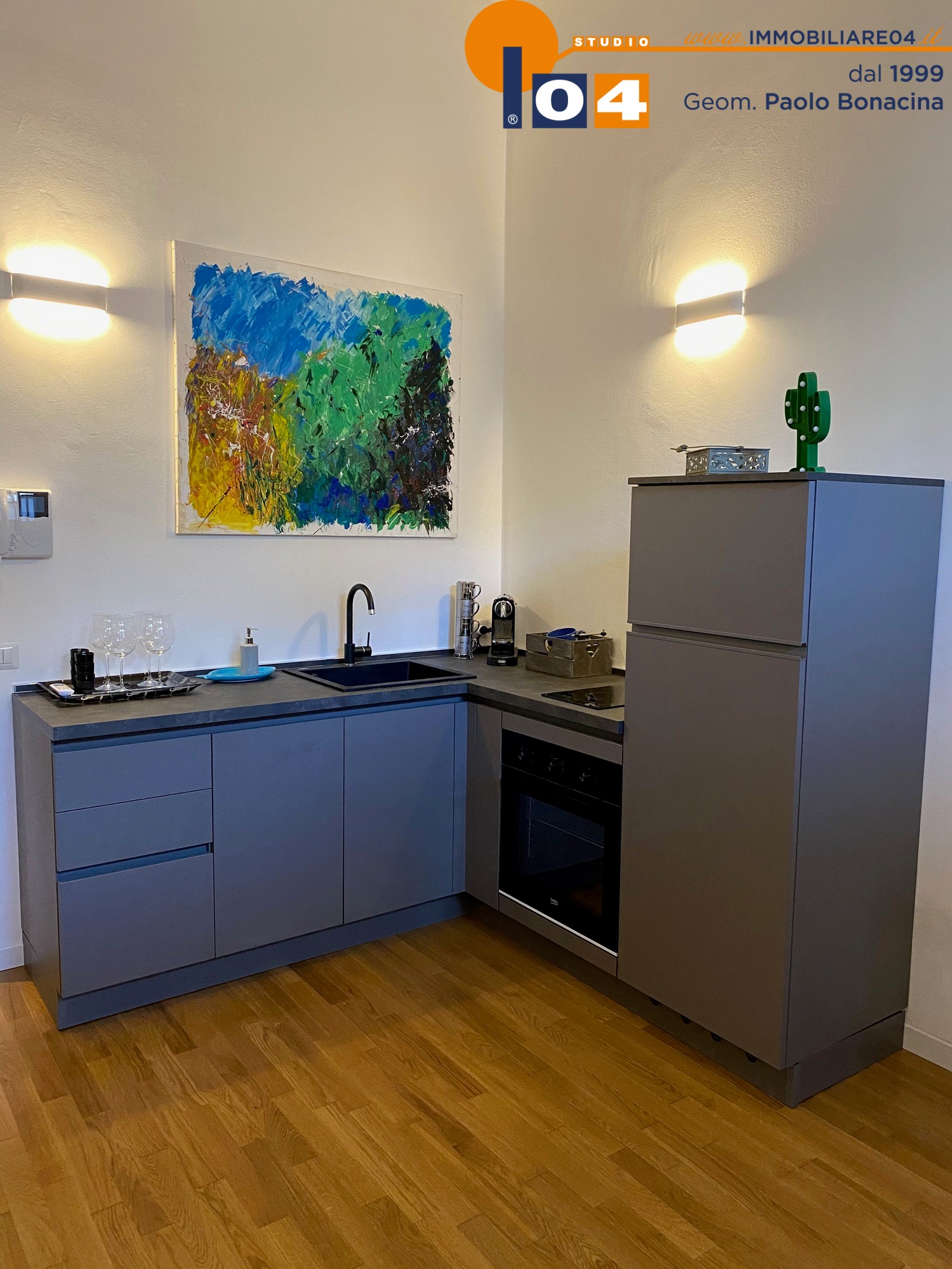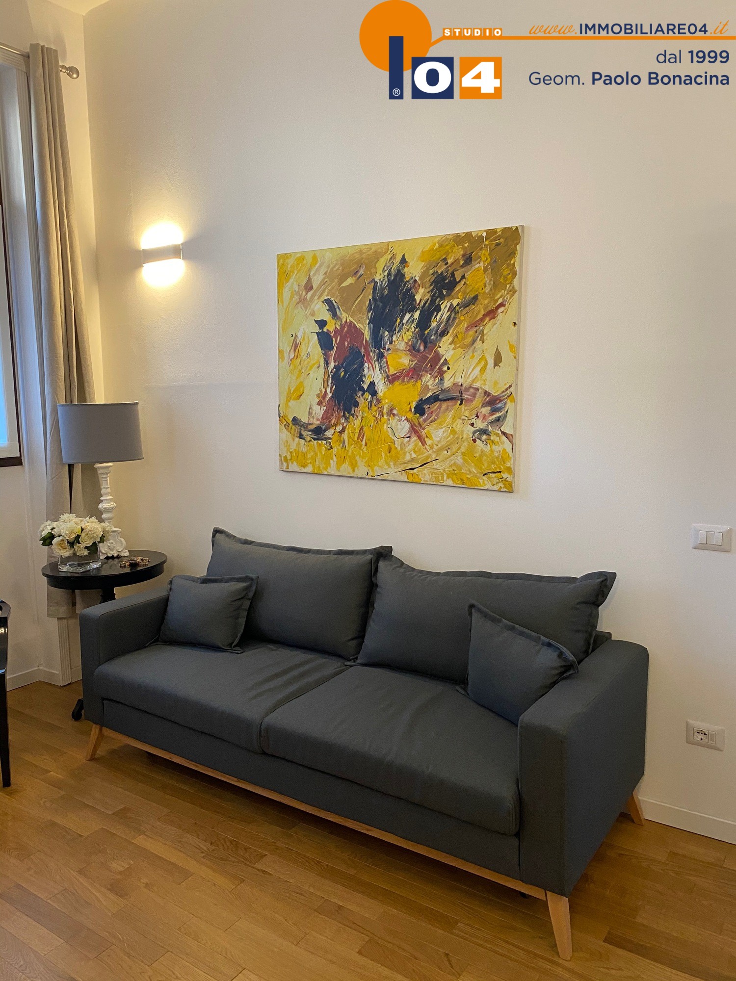 Luminosa zona living con cucina a vista su misura‚ disimpegno attrezzato ad uso ripostiglio‚ ampia camera da letto matrimoniale‚ bagno moderno con sanitari sospesi e box doccia. L’appartamento è rifinito con un arredamento contemporaneo di gusto e materiali di alto livello.