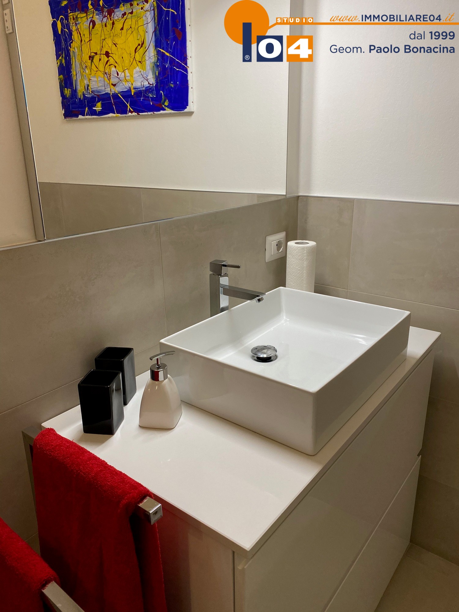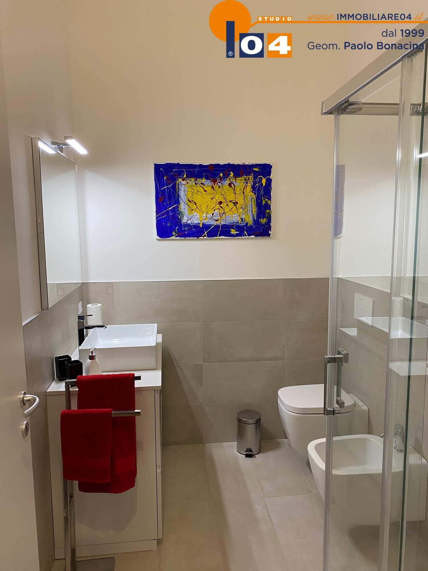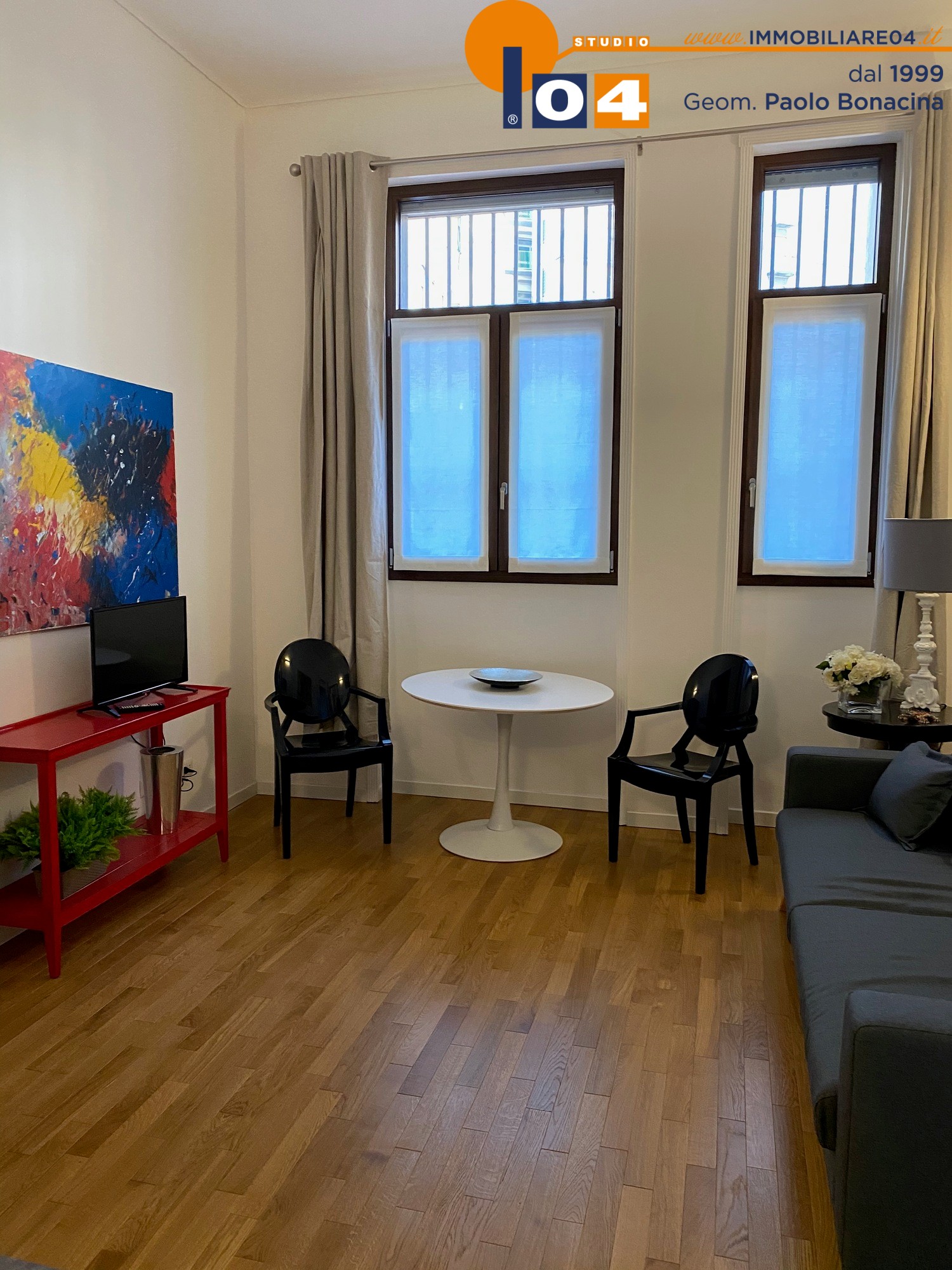 Luminosa zona living con cucina a vista su misura‚ disimpegno attrezzato ad uso ripostiglio‚ ampia camera da letto matrimoniale‚ bagno moderno con sanitari sospesi e box doccia. L’appartamento è rifinito con un arredamento contemporaneo di gusto e materiali di alto livello.
